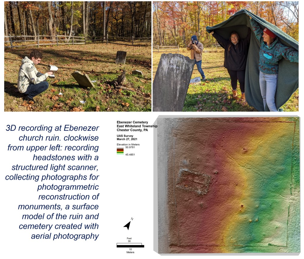 Between 2020 and 2023, course work focused on three sites in southeast Pennsylvania: Mt. Zion AME Church in Devon, the former Ebenezer AME in Frazer, and Historic Eden Cemetery in Collingdale. The primary objectives of student work and exercises at these sites is to reconstruct the original plans, layout, and histories of these spaces, to interpret our data in the context of broader histories of threatened and lost African American mortuary landscapes, and to share and develop our interpretations with the individuals and communities who care for them today.