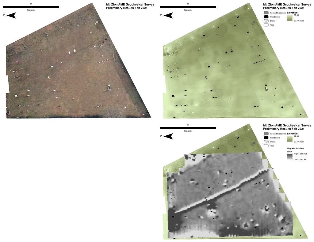 Shown at left are some examples of landscape-based investigations at Mt Zion AME cemetery. Clockwise from upper left: an aerial orthomosaic, photogrammetry-derived elevation map of the cemetery showing distribution of depressions and headstones, and a map of magnetic intensity showing the presence of a buried electrical line that crosscuts the cemetery and some burial positions.