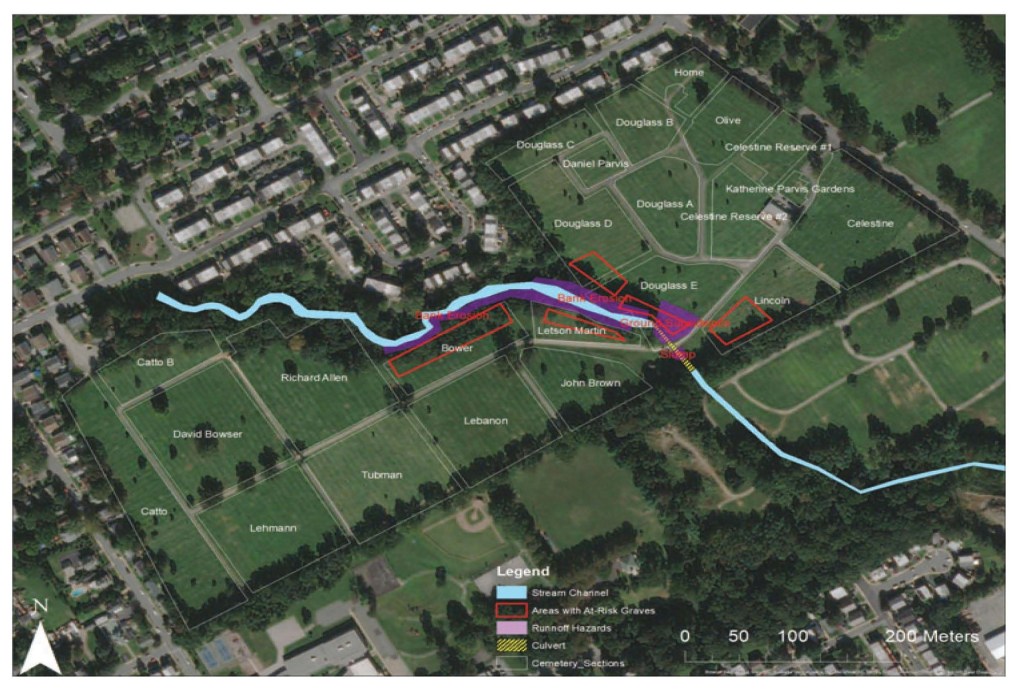 One student project, by former CAAM student Vaughn Ortner, brings together scanned plan maps, historic imagery, and public lidar data to create a flood risk map of Eden Cemetery in Collingdale, PA (after Ortner and Herrmann 2021)